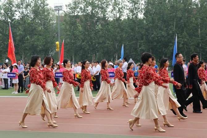 的师生们满怀喜悦的心情,以饱满的精神状态,挥动着手中的红蓝旗帜。舞蹈协会的老师们穿着鲜艳亮丽的服装,以优美动人的舞姿在方阵中心,形成一道靓丽的风景线,赢得阵阵喝彩。