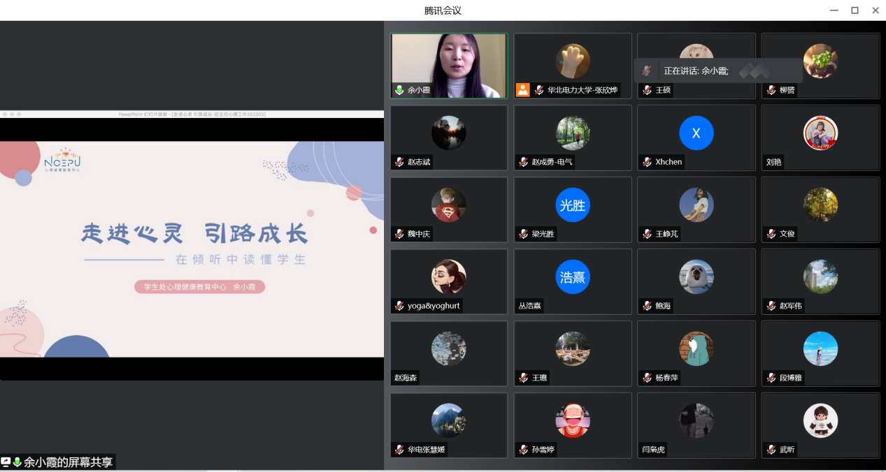 由知心工作室组织,于3月21日、3月25日以线上的方式分批次召开心理健康教育工作培训会,特别邀请学校心理健康中心教师余小霞为大家带来了“走进心灵,引路成长——在倾听中读懂学生”为主题的培训。近百名研究生导师、班主任、辅导员参加了培训,全体兼职辅导员也参加了培训。培训由在线赌博游戏