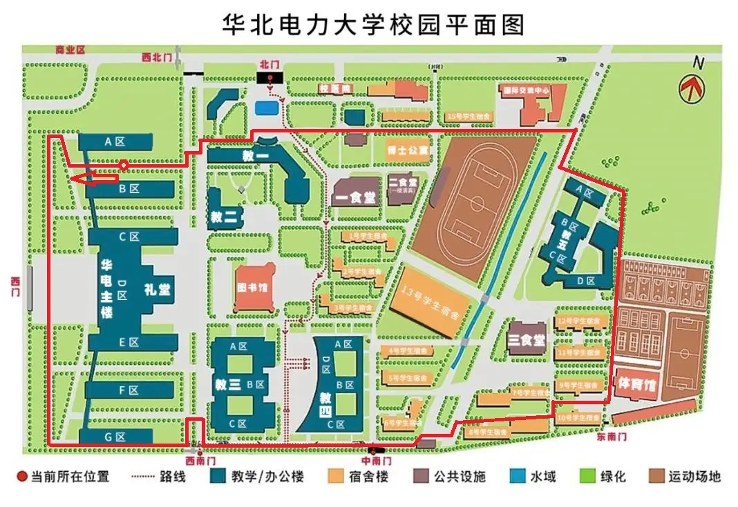 本次校园跑路线:主楼A座—西门—西南门—中南门—东南门—国交—教一楼—主楼A座,一圈约2.6km,共跑2圈,总距离约5.2km。