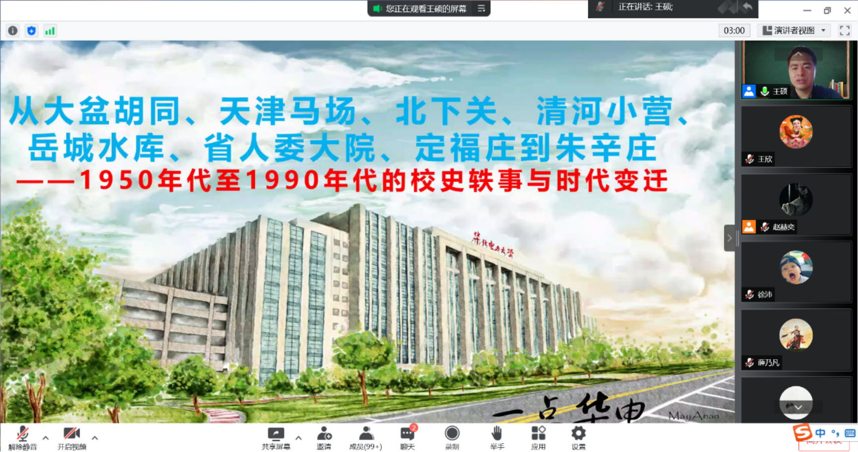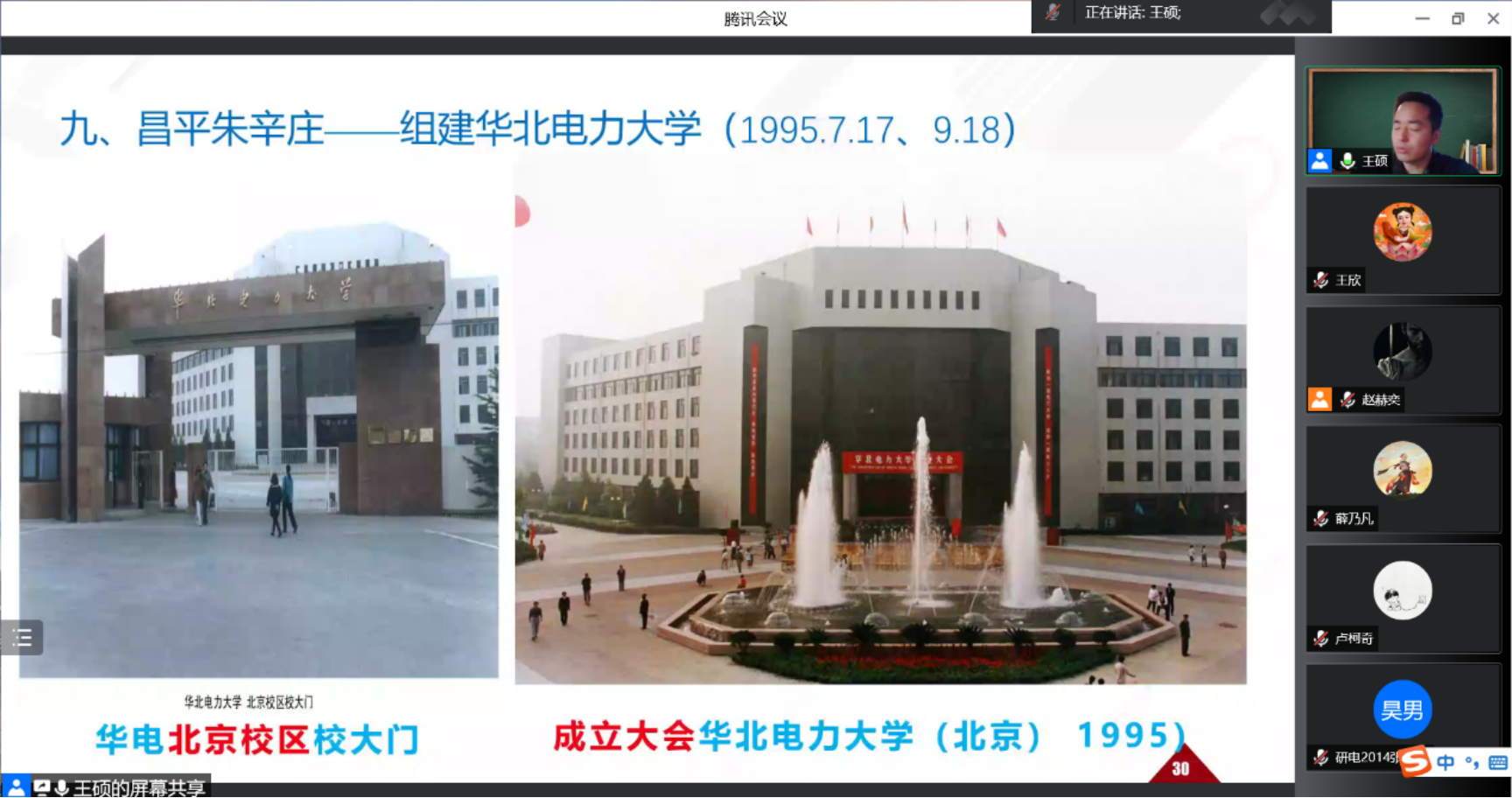 王硕首先向大家展示并概括讲解了学校从中央燃料总局电业职工学校到华北电力大学成立之间的五十六年历史沿革图,之后,按照时间顺序并结合时代背景,将该段校史变迁分为9个部分,通过影视资料、老照片等珍贵史料,为同学们讲述了在国家发展大背景下学校的发展轨迹,以校史中的学校奋斗历程和师生的成长故事,启迪同学们爱国爱校爱专业、奋发图强。最后,王硕结合自身在学校工作实际,谈及了自己对学校校史变迁的体会与感悟,并鼓舞同学们向着教师前辈、优秀校友学习,成为新时代的能源电力综合型人才。