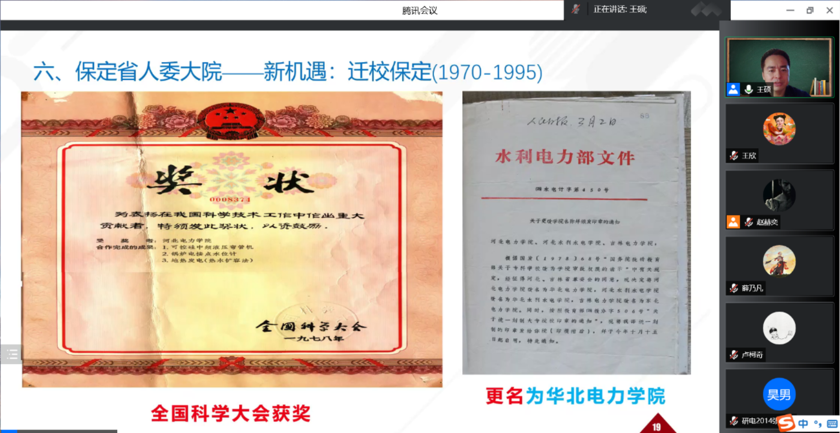通过讲述,同学们了解到学校的这一阶段九转曲折、艰苦奋斗的梗概过程,从昔日的燃料工业部电业管理总局职工学校到1995年的华北电力大学,学校可谓是历尽艰辛、筚路蓝缕,谱写了一部扎根大地办教育,政府、行业与学府互动发展的生动历史。“浸润幽燕文化,身处华北大地,这所学校肩负着国家电力工业化育人使命,虽有蜿蜒曲折,总在奋斗不息,小溪汇成大河,未来更为可期……”微讲座结束后,同学们收获颇多,对学校和专业更添热爱与崇敬,将在学校的教育和培养下,更加努力,共创美好的明天!