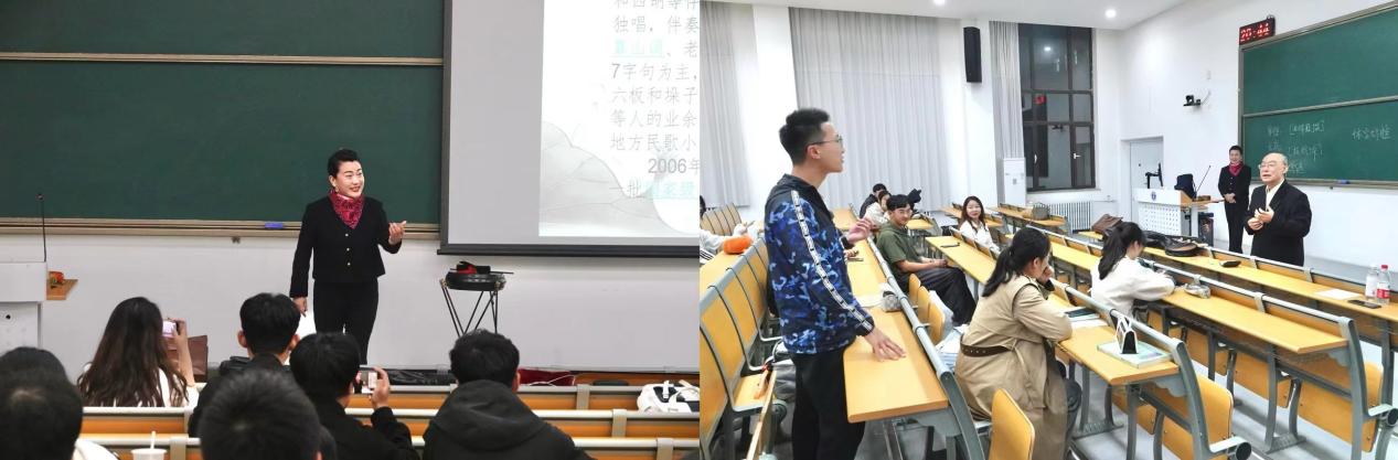 杨菲老师首先从曲艺与戏曲的区别出发为同学们阐释了什么是曲艺,并介绍了中国曲艺的发展史,旁征博引,引人入胜。随后,杨老师向同学们介绍了曲艺的主要类别,从有着浓郁地方特色的河南坠子,“大书为主,边说边唱”的西河大鼓,“热情豪爽”的天津时调,“易懂直接”的京东大鼓这几种地方鼓曲,到单弦、京韵大鼓与梅花大鼓三个宫廷曲种,杨老师和龚彪老师都亲身示范,为同学们表演了一段段经典剧目,让在场师生更直观地走进曲艺、欣赏曲艺。最后,杨菲老师表示希望大学生朋友能够更多地了解家乡的地方曲种,不断发现曲艺的独有魅力,挖掘展示中华民族传统文化的宝藏。