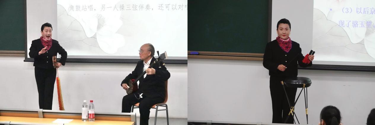 图1 杨菲老师与龚彪老师共同表演单弦 图2 杨菲老师表演京韵大鼓