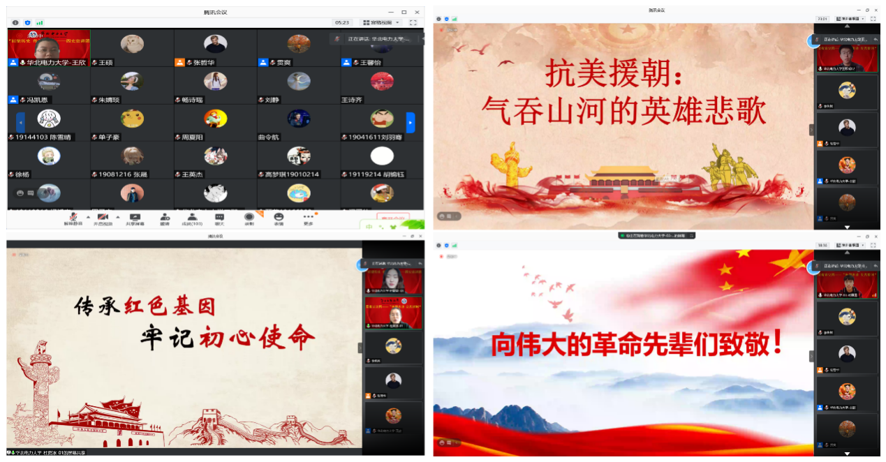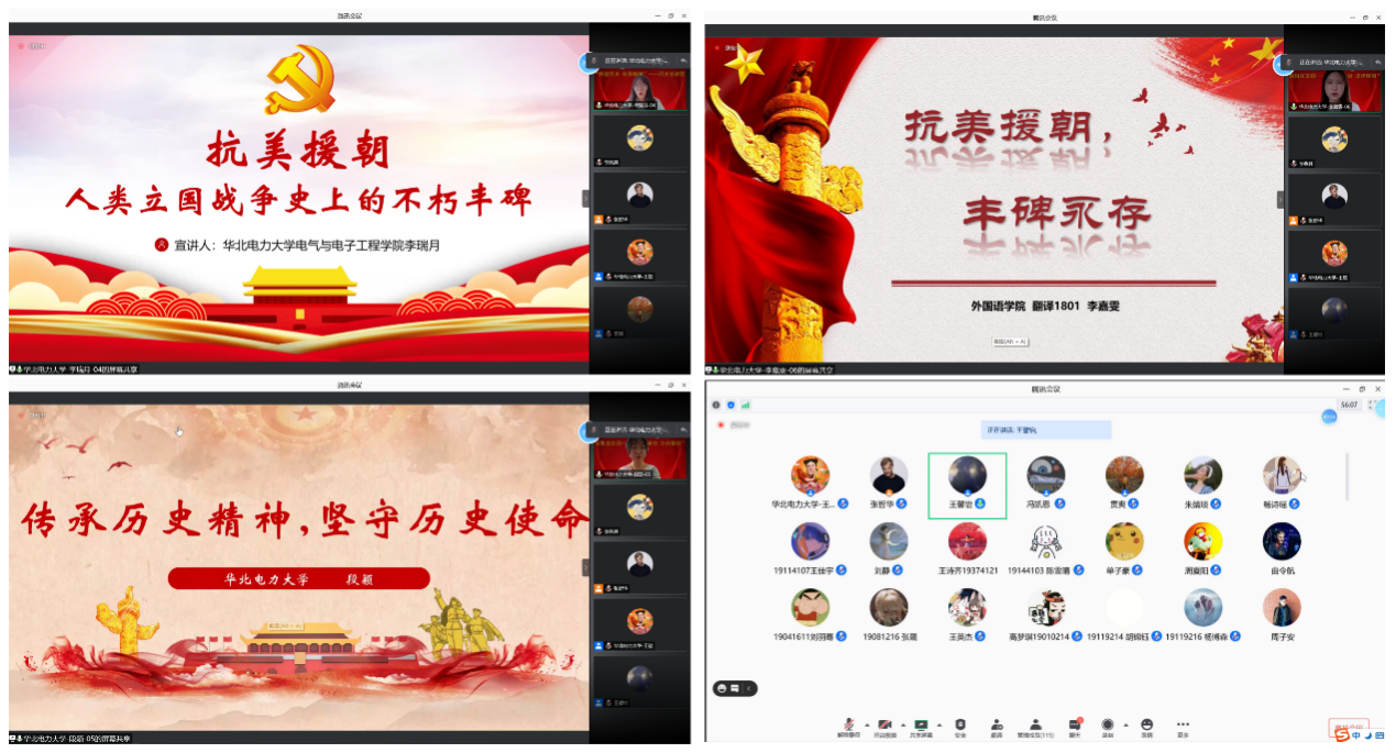 研电1903班杜夏冰和研电1908付宸宸作了题为“传承红色基因牢记初心使命”的宣讲,讲述了一位年近八旬的老人坚持为抗日无名烈士正名、寻找亲人,为抗战历史增光彩的事迹。电气1904班王郡成作题为“传承抗美援朝精神”的宣讲,讲述了一位英雄老兵结合自己经历回顾抗美援朝战争和如今对抗美援朝精神的传承。贯通电1901班时雁晨作题为“血战上甘岭”的宣讲,用故事和视频再现当年战斗的场景,突出上甘岭战役的惨烈,体现我军将士的英勇无畏。研电1908班李瑞月作题为“历史没有忘记-抗美援朝中的苏联对华军事援助”的宣讲,介绍了抗美援朝战争中武器装备的使用,围绕军队装备讲述相关故事。研电1909班段颖作了题为“传承历史精神,坚守历史使命”的宣讲,讲述了在新疆支教时,带领孩子们从课堂教学和现实走访中感受革命精神,故事生动感人。翻译1801班李嘉雯作题为“抗美援朝,丰碑永存”的宣讲,宣传了抗美援朝战士们的英雄精神,并且以抗疫精神呼应英雄精神,号召同学们来续写英雄篇章。