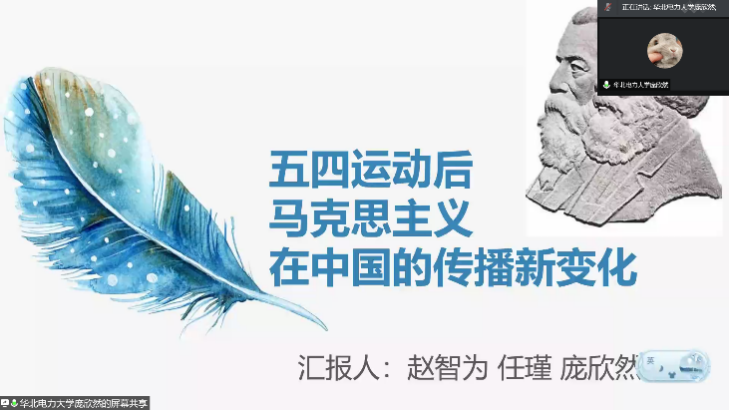 赵智为、任瑾、庞欣然同学作了题为《五四运动后马克思主义在中国的传播新变化》的读书分享。他们着重介绍了五四运动对于马克思主义在中国的传播的重要性,从五四运动的背景、作用和意义三个方面,详述了五四运动后马克思主义在中国的发展历程。并号召当代青年应担起当代中国马克思主义再传播的历史使命。