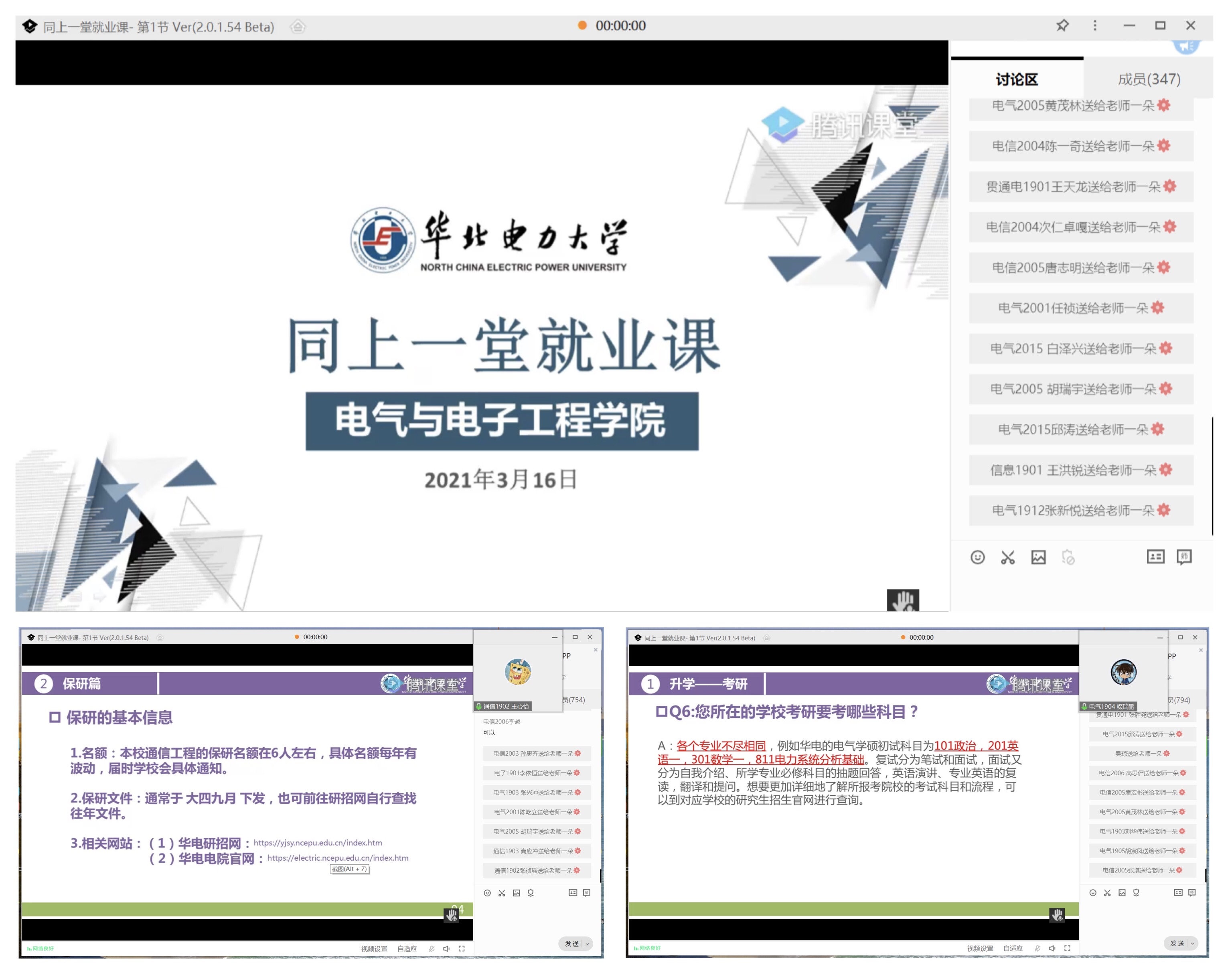 校友、本校教师、优秀本硕博毕业生,厘清了同学们关注较多的就业热点问题,然后认真备课,开展多轮试讲。有了这些准备,在此次“同上一堂就业课”活动中,不同专业的8名宣讲同学,顺畅、精彩的从就业、考研、保研、出国、学业提升等五个方面入手,将校友、老师、学长学姐对大家的谆谆教诲和殷切期盼传达给每一位同学,并以问答的形式为大家解答疑惑。同学们听讲认真,讲到精彩之处纷纷“献花”、点赞。