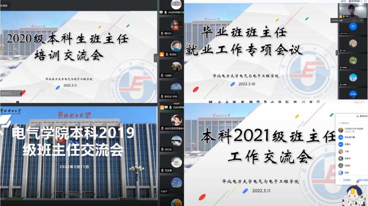 班主任工作的具体情况和要求,并结合各年级特点分享了往届班主任开展相关工作的成功经验。本科2018级辅导员结合前期调研数据,介绍了年级考研就业整体情况,数据按专业分类、按类型细分,使班主任老师们了解了同学们的现状及下一步打算;重点结合学校就业工作要求,围绕就业台账“一人一策”、精准掌握班级同学动态、重点帮扶困难学生群体落实去向等方面进行了介绍。本科2019级辅导员介绍了年级整体情况,并提出本学期年级工作重点为协调资源,在学生就业、考研道路上提供支持与帮助,加强和班级的协同;班级工作的总体思路为扎实考研,积极求职,强基提效,关注引导同学们为毕业去向做好准备。本科2020级辅导员通过梳理上学期成绩,与其他年级的主要学科挂科率的横向对比,分析原因;并指出本学期会继续做好心理问题学生的挖掘和关怀、鼓励学生积极参加竞赛以及党支部、班集体评奖评优工作;同时希望各位班主任能够关注重点学生的学业和心理问题,为学生创造参与科研的机会,让有想法的学生能够得到锻炼。本科2021级辅导员通过图表的形式对上学期期末考试中各专业各科及格率、优秀率、不及格情况进行了深入分析;基于大一新生入学后至今的综合表现分析当前存在的实际问题,并强调了本学期的三项重点工作,即强化学风建设、进行心理辅导、重视专业分流,同时指出了针对性的具体措施;此外,辅导员将同学们的期待同步分享给班主任们,展示了电院学子们对新学期的美好期待与对未来的无限向往。