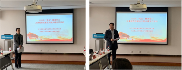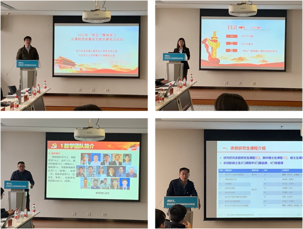 概论与纲要党支部骆小平、电磁与超导电工研究所副所长皮伟以及电磁与超导电工研究所所长赵志斌分别介绍了各自支部情况、本科生、研究生课程概况及课程思政情况。其中骆小平分享了2022年“两会”精神学习及融入课程思政探讨。希望通过领悟两会精神,结合中国特色社会主义的伟大实践,深入挖掘课程相关内容,寻求合理切入路径。