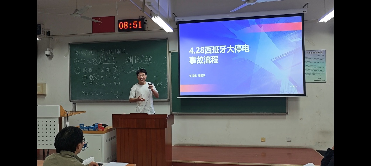 喵喵队解说题目是《4.28西班牙大停电事故流程分析》,该小组结合电力系统分析课程所学相关知识,对这起影响深远的停电事故进行系统性梳理。小组成员认为,本次事故发生的原因是瞬时响应资源不足、短时间调节资源耗尽、跨区联络能力存在先天不足等多方面因素综合作用的结果。通过对事故演化过程的深入剖析,该小组不仅还原了停电事故的完整链条,也在讲解尾声抛出问题,巧妙地将事故分析与课程理论相结合,成功激发了同学们对有功调频和无功调压章节的学习兴趣,实现了以案说理、学以致用的效果。