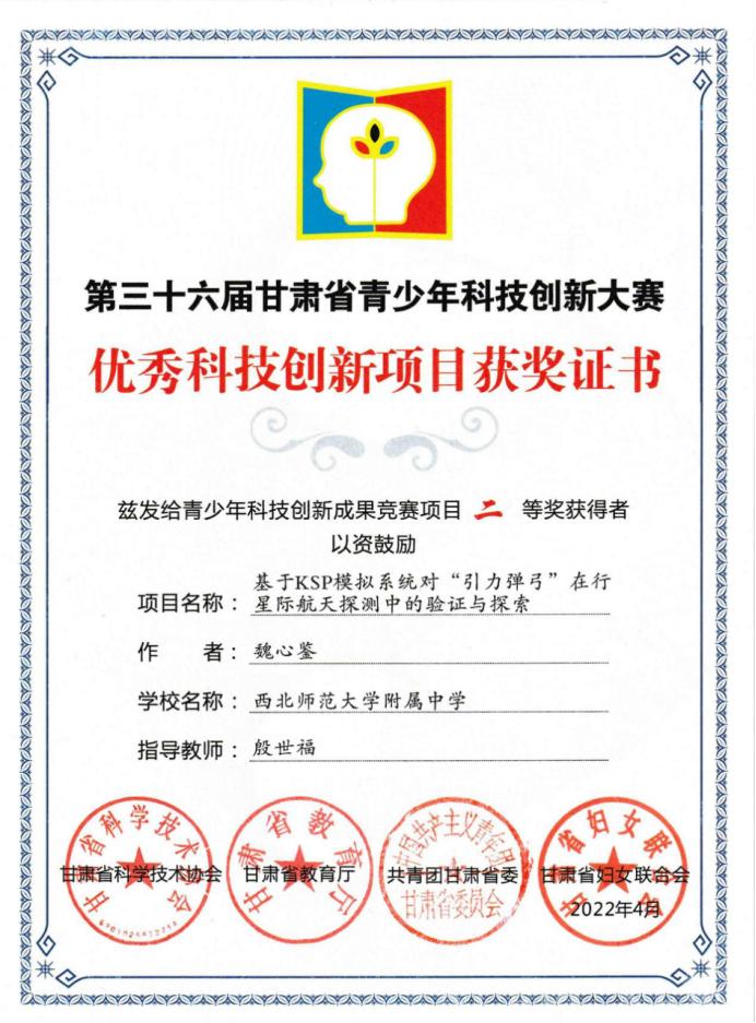 中华儿女多奇志,漫步寰宇问苍穹。魏心鉴还有着对航空航天的热爱。他深知一次次长征腾空、嫦娥落月的背后是无数科研人员的孜孜不倦、精益求精。他将这种精神化于学科探究之中,高二时看到第三十六届全国科创比赛的举办消息,他不假思索地报了名。面对科创大赛“创新度、实践度、精深度”的办赛理念,基于对航天的喜爱与相关专业知识,魏心鉴将自己的研究课题定为了《基于KSP模拟系统对“引力弹弓”在行星际航天探测中的验证与探索》。从调阅论文、查阅各国相关资料、设计测试方案、组织模拟测控网,到“引力弹弓”轨道设计、单个航天器的设计布局、发射,再到将笔下的轨道设计还原到模拟系统中、模拟各国有关探测器的变轨过程,魏心鉴全部自行完成,最后呈现出自己的课题报告并完成现场答辩,最终获评为省级二等课题。每当遇到艰深的理论或模拟中不测的意外,他也有过无从下手和迷茫彳亍。他热爱航空航天,不单单欣赏腾飞升空的绚丽和遨游天宫的浪漫,更感动于能让这些庞然大物如燕般翻飞的力量与精神。“从最小的旋翼机到偌大的空间站,工程师们能够将它们从图纸变为现实,从零件变为整体,从实验室走向空天,背后一丝不苟、尽善尽美的精神,不应该是每一个华电人应有的品质吗?”魏心鉴说出了他热衷科技创新的原因。他以华电甘肃省第一名的成绩进入在线赌博游戏