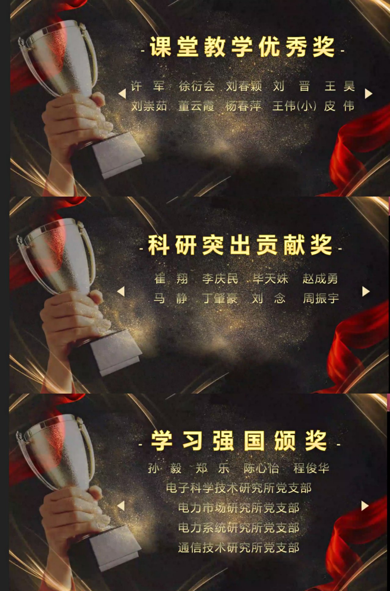 授予许军、徐衍会、刘春颖、刘晋、王昊、刘崇茹、董云霞、杨春萍、王伟、皮伟等10位教师课堂教学优秀奖,授予崔翔、李庆民、毕天姝、赵成勇、马静、丁肇豪、刘念、周振宇等8位教师科研突出贡献奖。同时对使用学习强国优秀个人和组织予以表彰,授予电子科学技术研究所党支部等4个党支部优秀组织奖, 授予孙毅、郑乐、陈心怡、程俊华等4名同志学习成绩综合优秀奖。